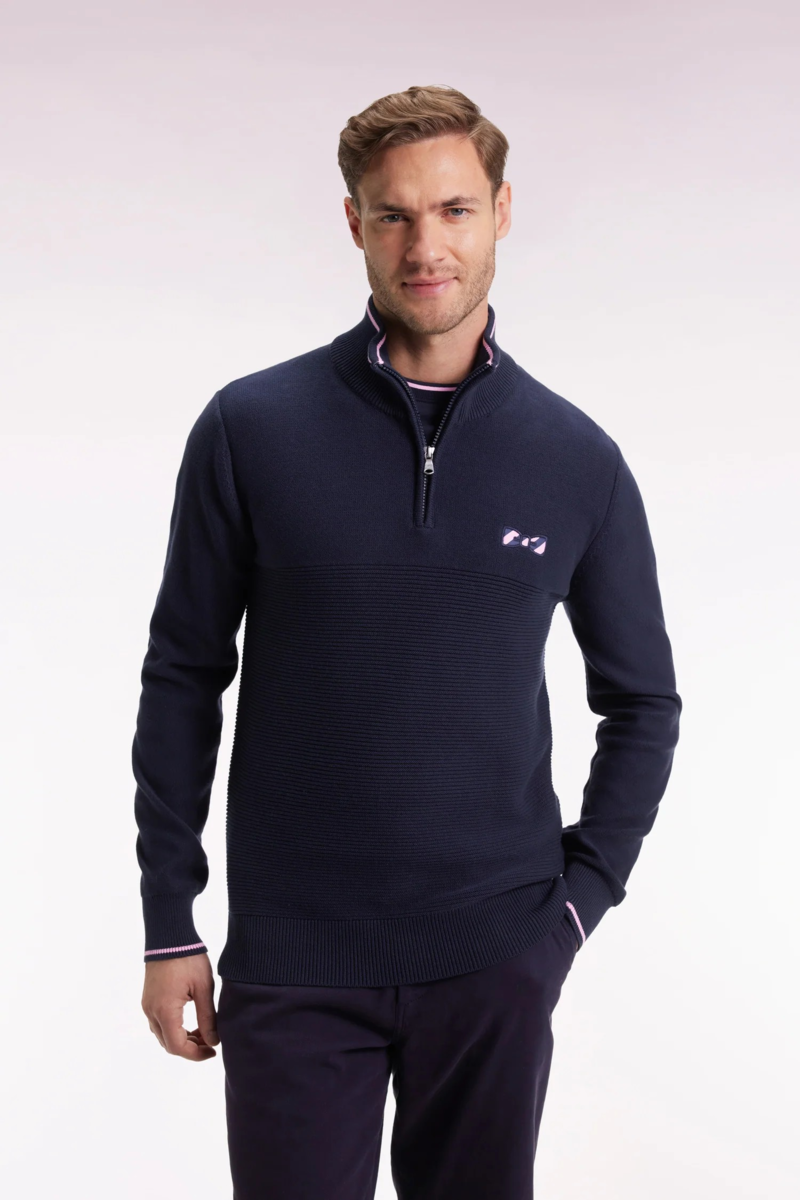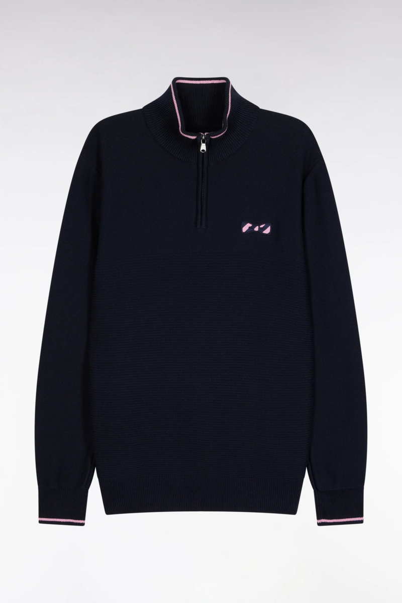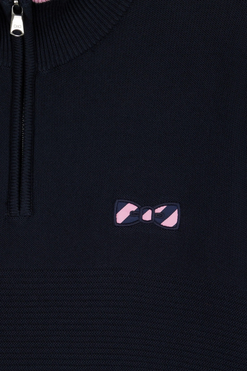 Les amateur du style French Flair typique du vestiaire Eden Park reconnaitront ce pull comme un incontournable. Graphique et élégant, ce pull à col montant zippé se distingue par son tricotage alternant points Ottoman et jersey, créant un subtil relief sur le corps. Le liseré contrasté sur le bord du col zippé et le large n½ud papillon brodé rehaussé de tissu cravate rayé signent ce modèle chic et original.